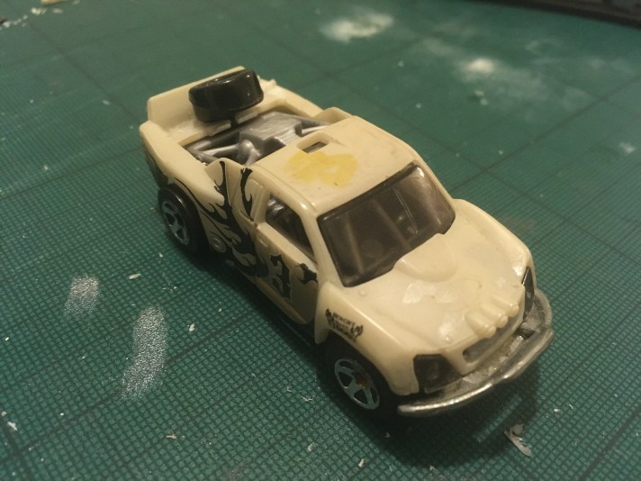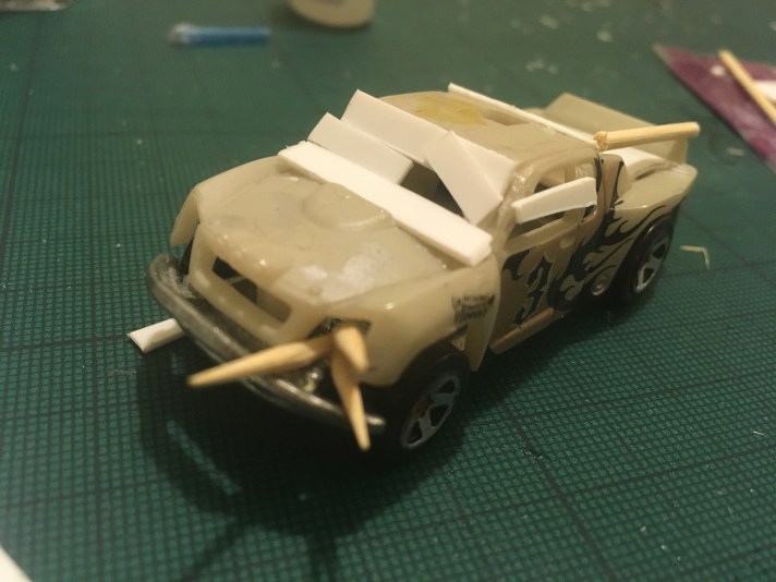 Now I’m left with reinserting the headlights…or alternatively I could place some guns( no small enough bits) or perhaps place a lot of spikes in the gaps. I also wanted to place some bars on the cargo area. Just a mock up for the mo.