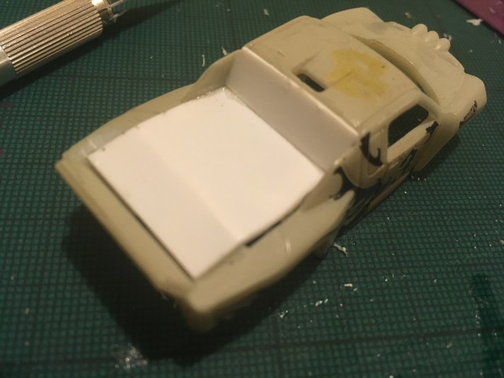 I wanted to save the bits for another project, so I decided to cover up the cargo area and block in the windows. I may place some embossed double diamond stuff on the cargo area to for a stand platform.