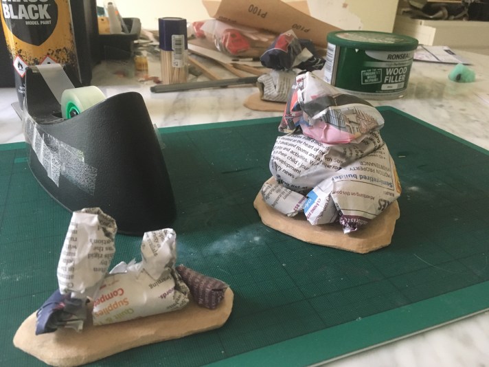 I cut some mdf which I had laying around. Big saw and then a Dremel to shape and bevel. I made lots of balls of newspaper and taped them. Balancing roughly on the bases, I tried to create non-gravity defying irregular and organic shapes for the rock formations.
