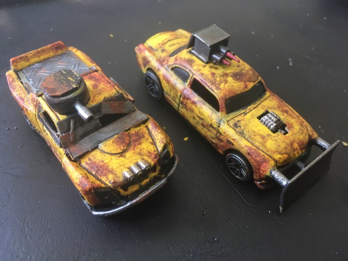 The aim was to create a couple of strong yellow cars, but the yellow paint refused to go on smoothly. I have no idea what was going on. In the end I opted for rust effects to hide the issues.